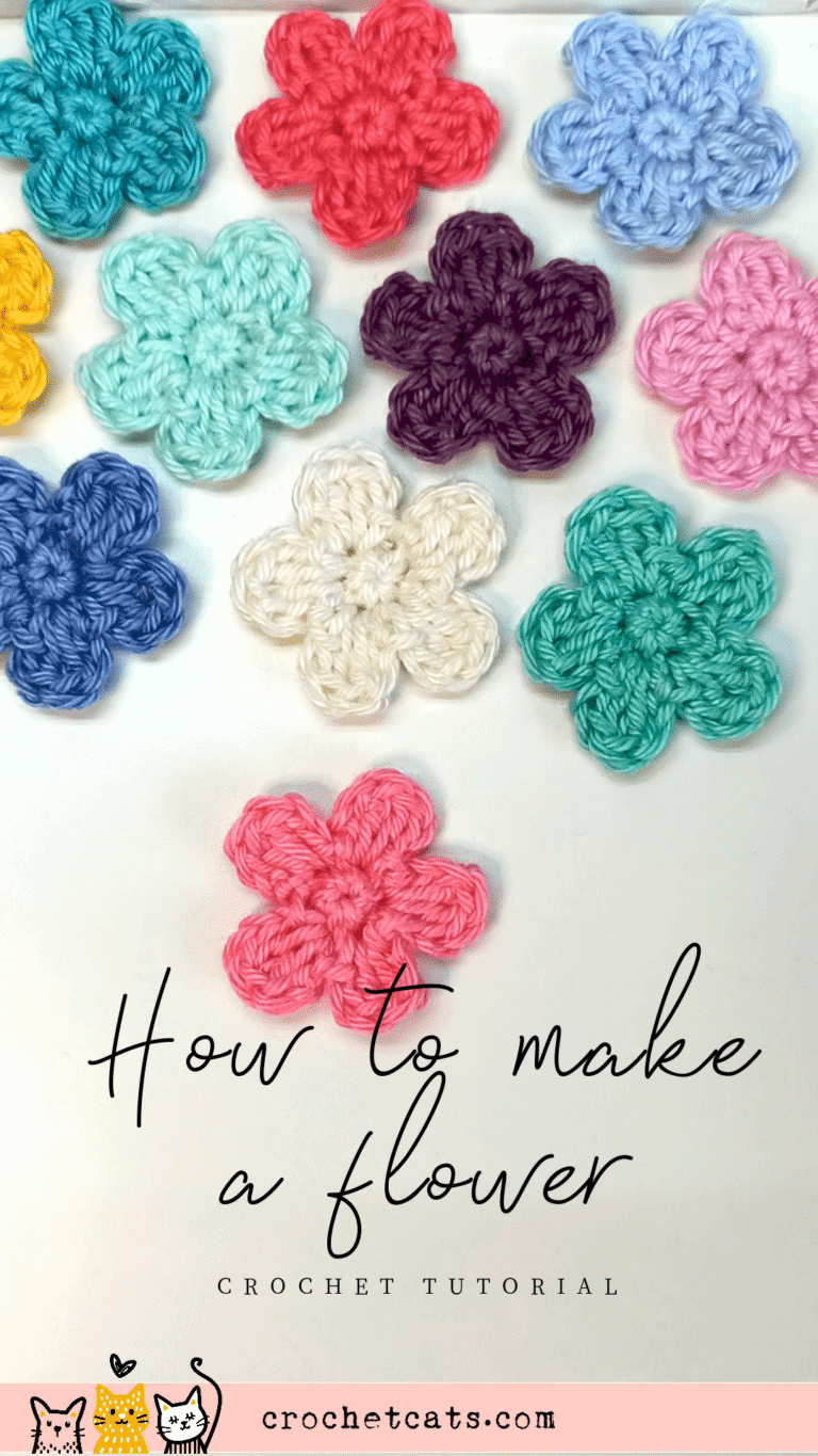This little 5-petal flower is about 1.5–2 inches across depending on yarn/hook and works up in under 5 minutes.