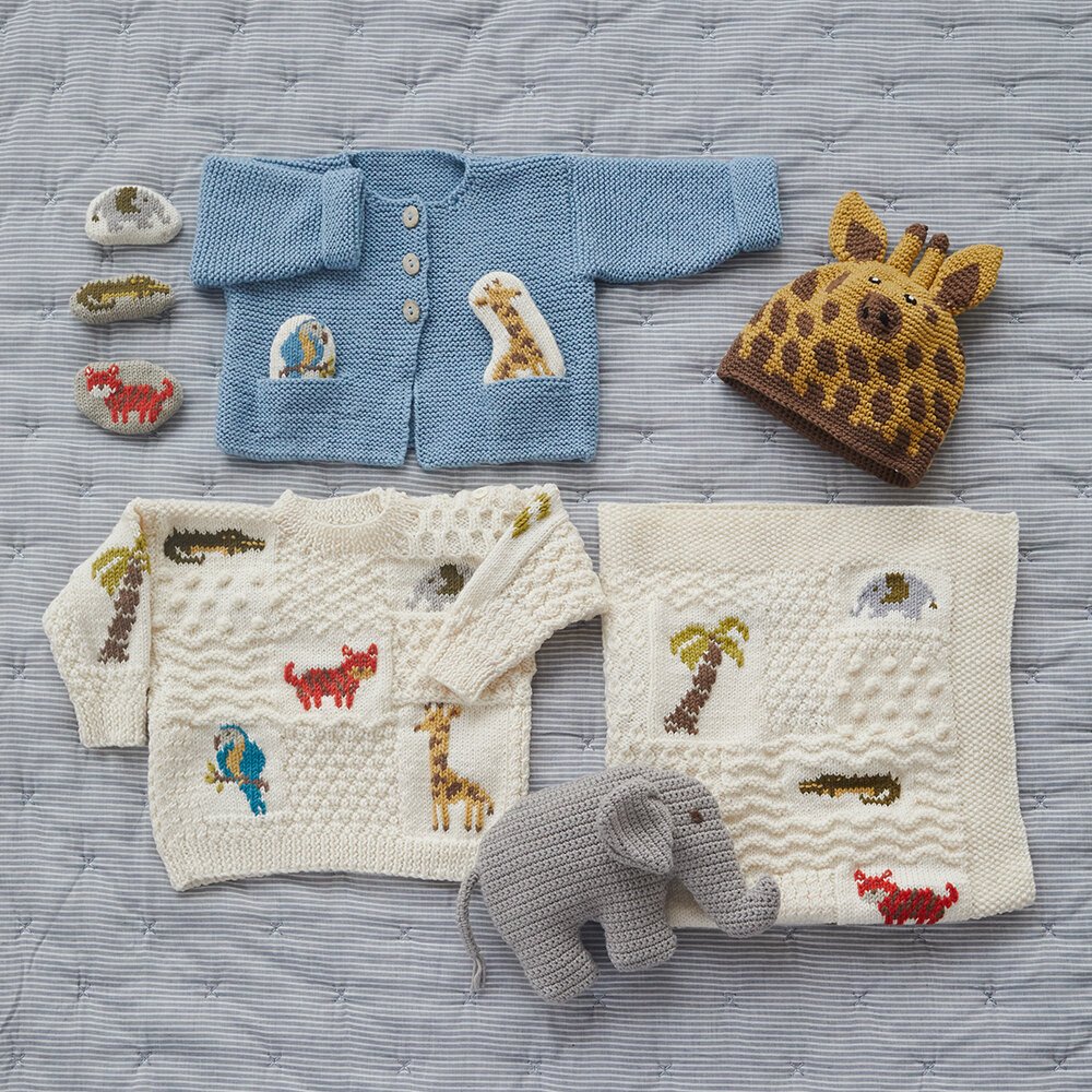 Debbie Bliss brings you a new, modern take on a layette with Animal Magic to bring a touch of wonderful wildlife to your baby knits. This set is made up of six sweet patterns in the irresistible Eco Baby Wool and includes a classic garter stitch jacket, animal themed sweater, blanket, and pocket toys, along with an adorable crochet giraffe beanie and elephant toy. Animal motifs adorn the collection, which can either be created in color work or swiss darned afterwards, so whether you’re looking to make a single pattern or craft the whole set, the patterns bring you all the steps and charts you need.