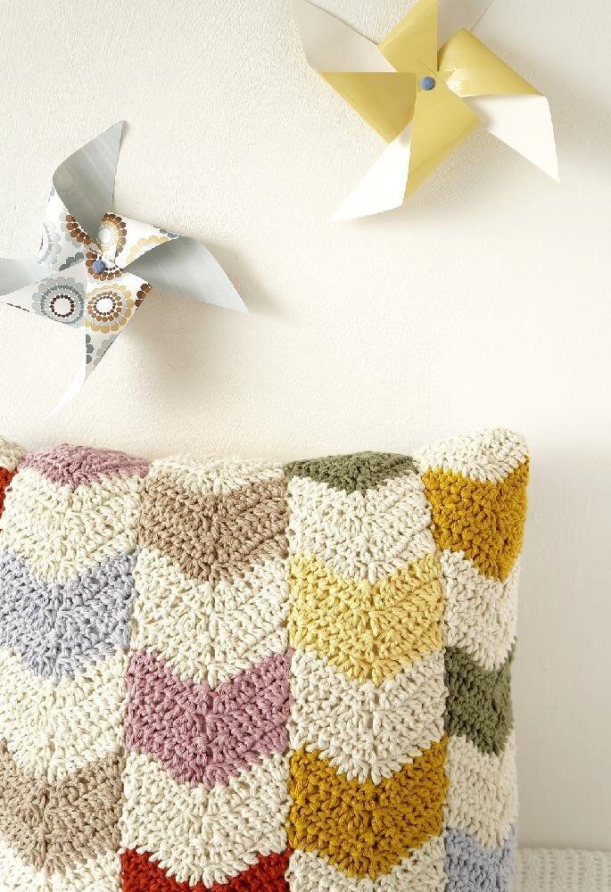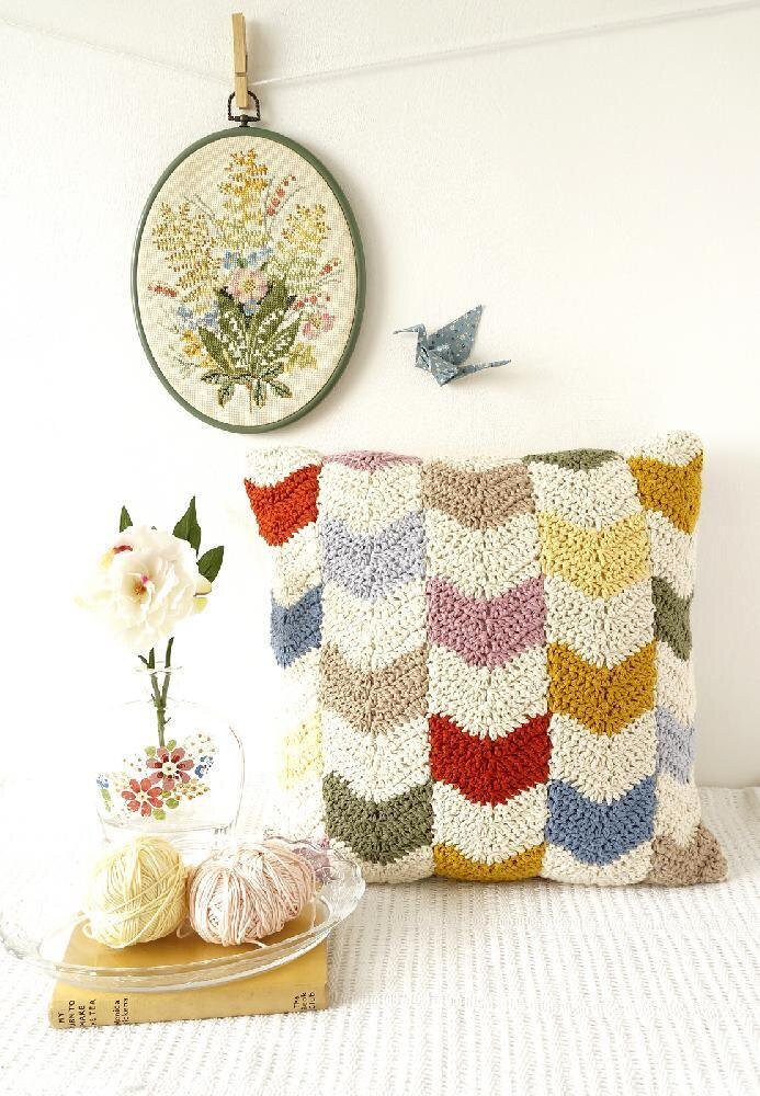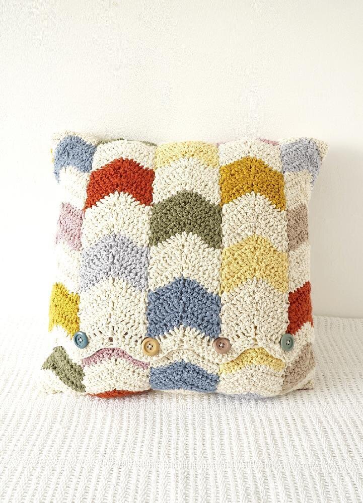 This delightful and colourful modern geometric design is easy to make. With lots of photos and instructions (in both UK and US terms). Ideal to brighten up any seat or room and great to make for a gift. The cushion cover does have a opening to remove the cushion pad.