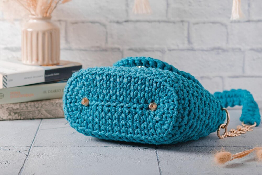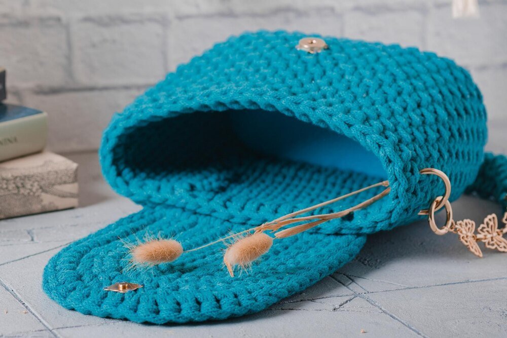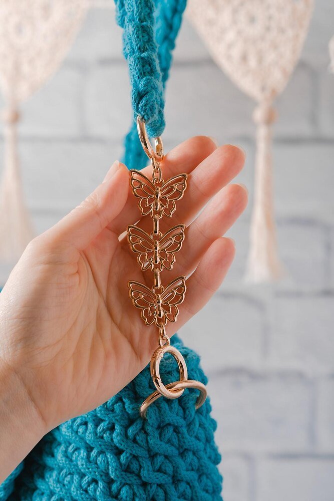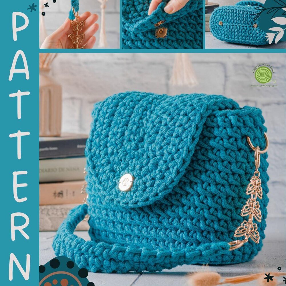 Create your own stylish crochet bag with this easy crochet bag pattern—perfect for crocheters of all levels! Crafted in one piece with a seamless 3D wicker design, this handmade bag features an oval base and a half-round lid secured by a magnetic button. The crochet purse is finished with a removable shoulder strap, detailed with a delicate metal chain and butterfly accents for an extra touch of charm.