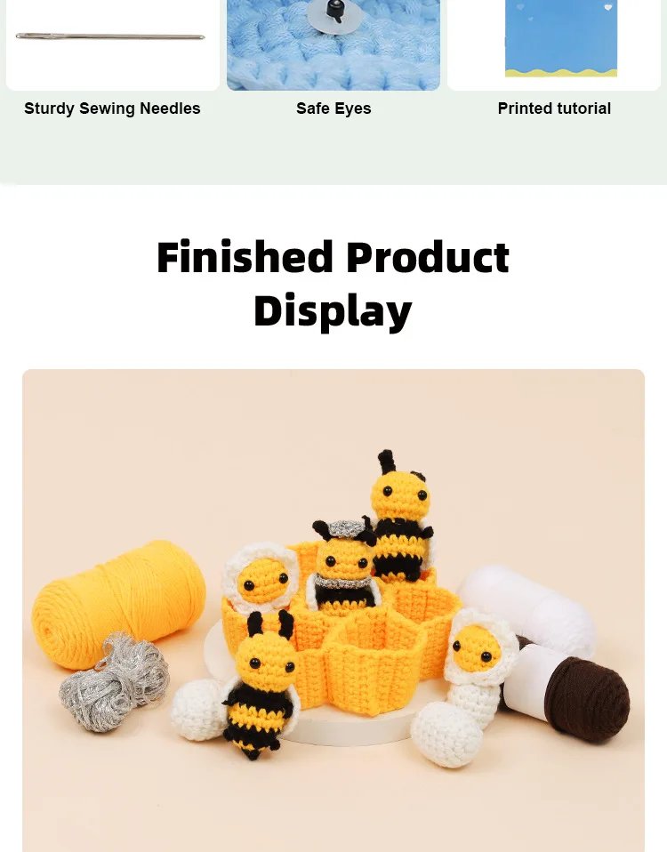 - Complete All-in-One Set – Comes with high-quality yarn (yellow/black/white for classic bee stripes, plus honeycomb accents), ergonomic crochet hooks, stuffing, safety eyes, needles, stitch markers, and other essentials – start crafting immediately without extras.