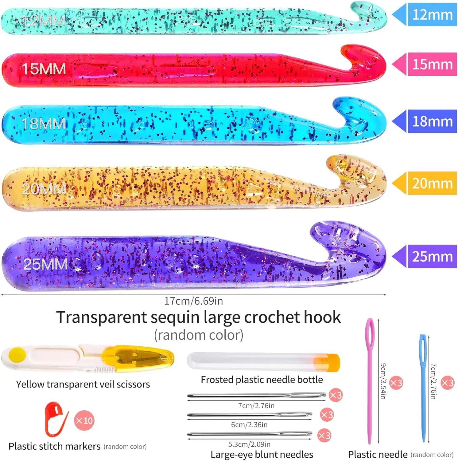 Create stunning chunky blankets, rugs, scarves, and oversized amigurumi in record time with this premium large crochet hooks set! Featuring 5 massive translucent crystal-clear hooks (12mm, 15mm, 18mm, 20mm, 25mm), plus essential accessories: 10 stitch markers, 6 plastic sewing needles, 3 sizes of blunt-tipped large-eye needles, and a handy pair of scissors.