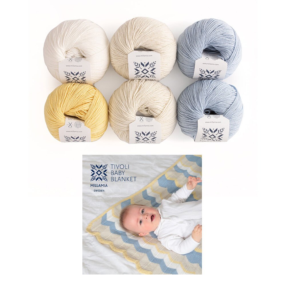 Knitting kit for MillaMia Tivoli Baby Blanket. Finished size approximately 27½in x 24½in (70cm x 62cm).
