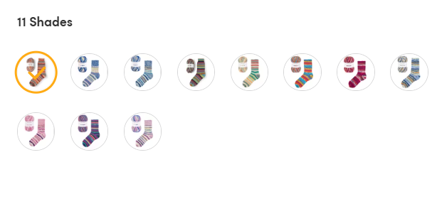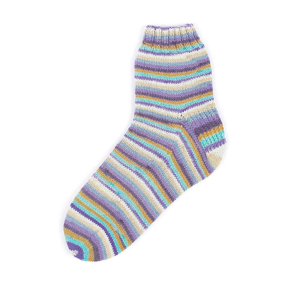 This yarn has wonderful striping with beautiful color combinations. The only thing you have to take into consideration is to match the beginning color combination used in the first sock when knitting the second sock so that they match perfectly. This yarn comes in several colors. I have knitted all I could find and the socks have become my children’s’ favorites. The yarn has a very nice hand. I highly recommend it and will continue to buy it in the future!