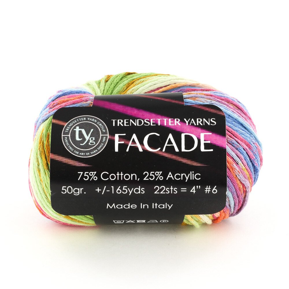 Trendsetter Yarns Facade is all about color and texture. This tubular chain style yarn uses two different fibers which are each dyed and chained differently. The unique process creates a random change in color and texture, producing a variegated striping effect. Play with textured stitches or play with your direction of knitting to really enjoy just how fluid Façade can be.