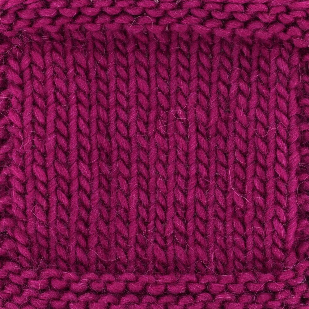 The color is true to the photo, and is ever so slightly variegated, but overall looks like one color. It is knitting up into a medium weight, warm, soft fabric with nice stitch definition. The category of “bulky” is accurate.