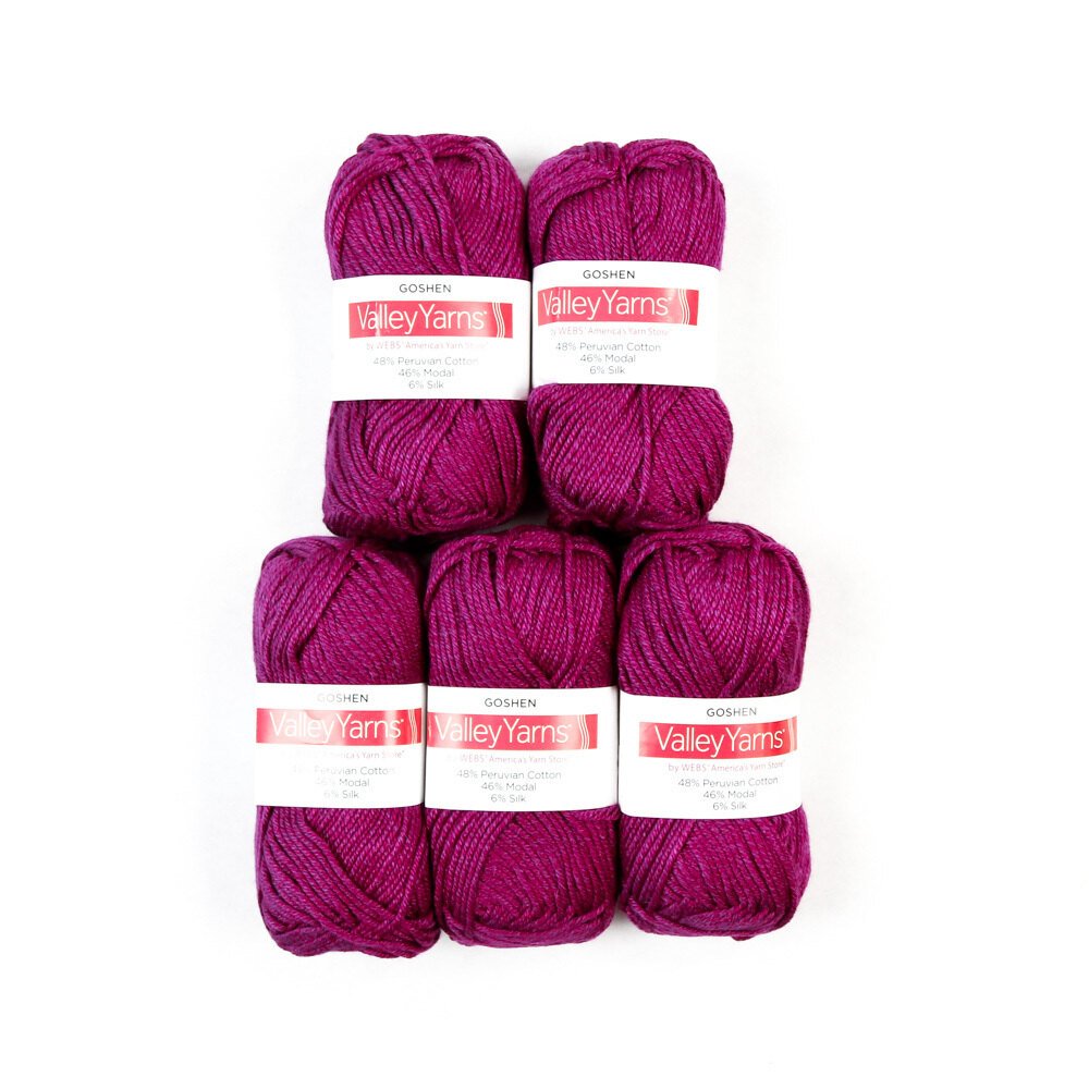 Lightweight, elegant with a softness you’ll love, Valley Yarns Goshen is the perfect yarn with which to see in the warmer weather. Made of a blend of Peruvian cotton, modal, and silk, this worsted-weight yarn will knit or crochet clothes and accessories that are guaranteed not to pill. Hand wash only.